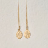 Our Solid Gold Small Virgin Mary Necklace is a beautiful and meaningful piece to keep your faith close every day. The solid gold oval pendant features an intricate depiction of the Virgin Mary on the front, with a cross and the letter "M" interwoven on the reverse, symbolising faith and devotion.